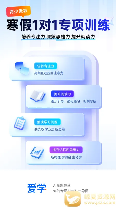 爱学2026官方最新版本是专为中小学生打造的AI智能导师平台,涵盖全学段学习资源,有丰富免费课程,支持AI 1v1教学、个性化学习计划,能自动批改作业,多模态交互,帮助孩子高效查缺补漏,提升成绩。