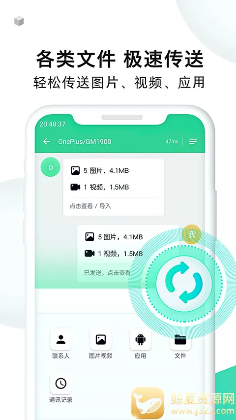 2. 多种传输方式可选:支持热点和WiFi两种传输方式,全程无需网络,能高速进行数据传输,且传输类型丰富,包括通讯录、图片、音乐、视频、应用等,数据点对点传输,安全放心。