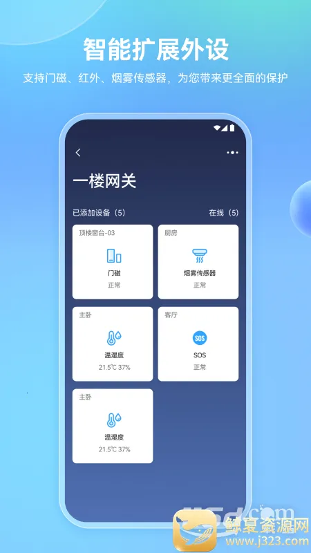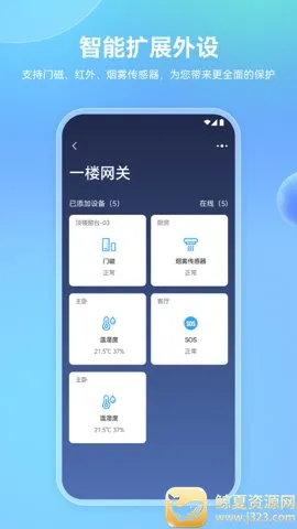 4. 智能扩展外设:支持门磁、红外、烟雾传感器,为你带来更全面的保护,全方位守护家庭安全。