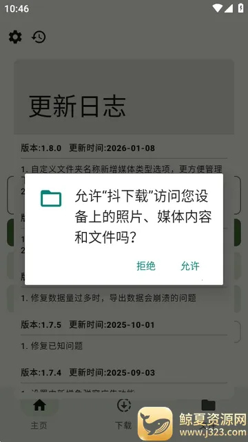 抖下载2026是一款出色的抖音短视频下载工具。它最大的亮点在于**无广告且自带去水印功能**,能给用户提供干净专业的下载环境,一键获取无水印视频。界面简洁操作方便,下载速度快,可保存音乐、短视频等多种内容。使用时允许文件访问权限后,复制链接就能轻松下载,还支持批量操作。其功能丰富,能分享资源、搜索多样、下载体验直观高效,优势明显,一键下载无水印保存,还有视频管理功能,满足用户多样化需求,是下载抖音视频的得力助手。