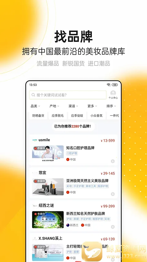 1、汇聚前沿品牌资源:拥有中国前沿的美妆品牌库,涵盖流量爆品、新锐国货、进口潮品等,品牌库持续动态更新,助您快速锁定潜力合作对象。