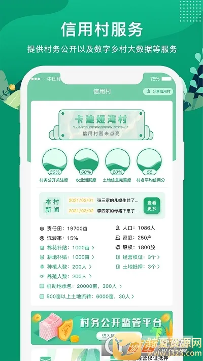 e聚农宝是专注土地流转与农户种植的软件,基于农业大数据构建信用服务,以信用分享权益。为多种合作社提供一站式服务,可便捷办农事农资,累积信用享银行资金等优惠,邀好友能提分,快来体验。