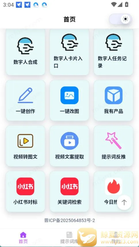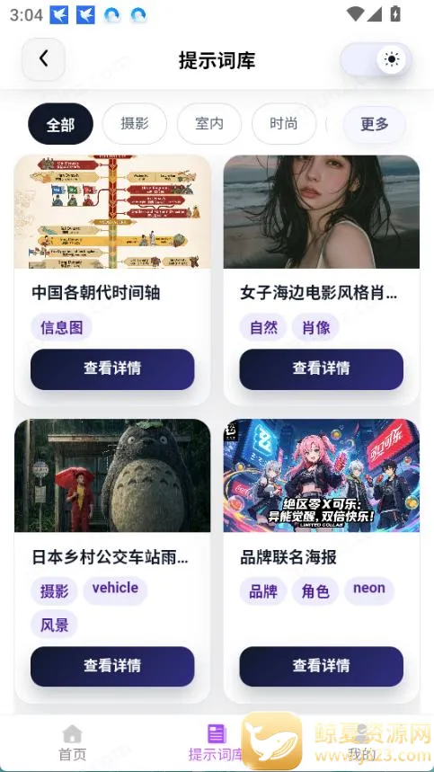 3、进入「提示词库」,按分类选择预设提示词,或用「提示词反推」生成指令。