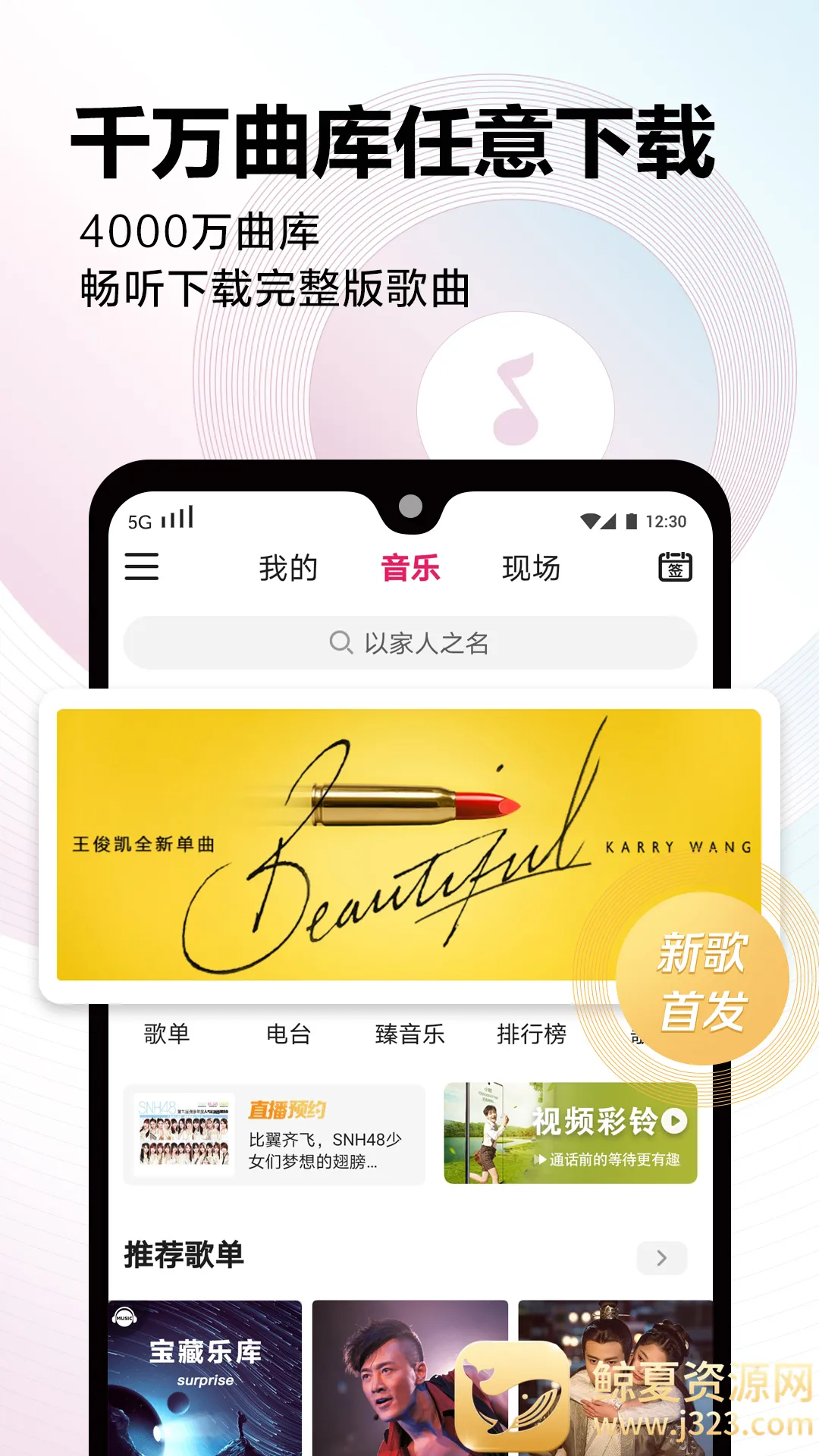 2. 明星云集,曲库超全:热门歌手全覆盖,千万正版歌曲,新歌首发、影视综艺原声等畅听无阻,给您完美音乐享受。