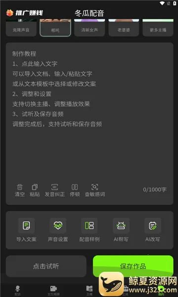 2. 智能AI配音强大,输入文字秒转语音,还有AI帮写、润色及一键合成功能,操作简单便捷。
