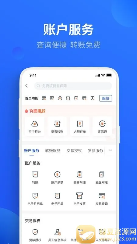 功能多样:具备空中柜台、语音转账、大额存款等各种功能,还有融资推荐,能智能匹配集成融资产品,支持在线测额,审批速度快,精选金融产品,理财灵活。