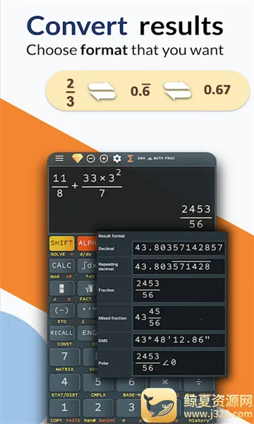卡西欧计算器功能超强大!它有数百种计算方式,能满足不同学习用户需求。基本算数计算模式外,还有专业数学计算,能快速切换模式。软件特色满满,比如有自然显示器,能像教科书一样显示数学表达式,增加结果理解力。它有方程求解器、多种度量转换、复数计算等功能。想把分数变成小数,在手机版上按小数分数切换键就行。要是想调回正常计算模式,打开手机版后点击MODE键,在要打开的模式页面中选择基本算术点击即可。操作简单易懂,中文菜单直观,运算精准无误差,从日常练习到竞赛考场都适配,不管是学生学习,还是生活记账、处理数学物理计算等,都能轻松应对,随时随地高效计算,全方位满足你的计算需求。