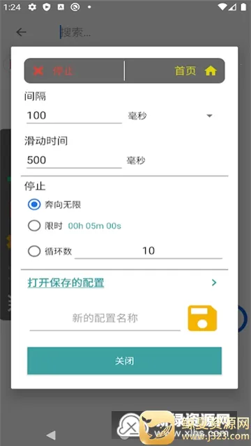 2.配置 “间隔时间”“滑动时间” 以及 “停止条件”(如限时 5 分钟或循环 10 次),也可保存当前配置备用