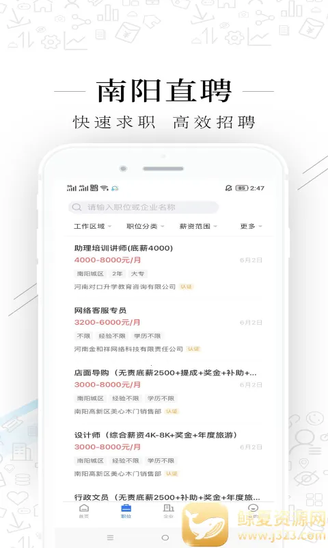 南阳直聘是一款超棒的手机招聘软件。它能为求职者提供大量准确职位信息,各种求职需求都能满足。职位智能准确匹配,机会超多,且企业职位均人工审核,6重严审保障真实有效。与HR在线畅聊,在家就能轻松换工作。这里工作范围超全面,每天更新高质量职位,还能根据需求推送。支持创建电子简历,投递方便。它的服务很棒,实时更新,岗位种类丰富,有全职和兼职。填写求职需求,遇到好职位会推荐。搜索功能强大,一键找到心仪工作。对于担心错过面试邀请的人来说,求职动态一目了然。投出简历后回复迅速。无论是求职者还是招聘人员都很适用,能更好地满足大家找工作或招聘人才的需求,是找工作的可靠帮手哦。