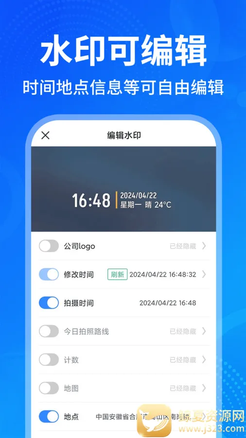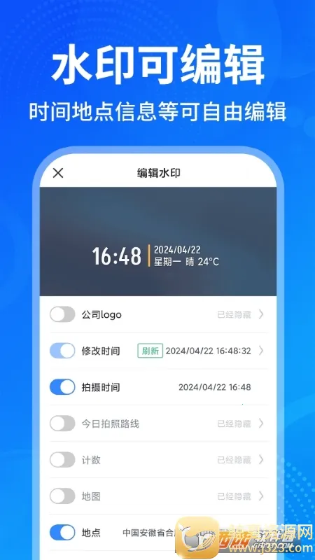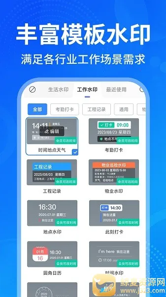 2. 功能多样:不仅支持给证件打水印、自拍美颜,还能记录工程影像资料,满足考勤打卡、地点水印等多方面需求,提供多种多样的水印模板。