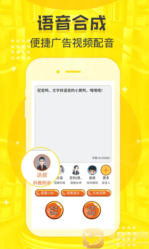 配音鸭文字转语音免费版由合肥阅舟科技开发,有超多声音模板。用途广泛,操作简单,一键制作导出。融入AI技术,模拟真人情绪。提供多种配音功能,支持多种格式导出,还有丰富素材和教程,更新含客服配置。