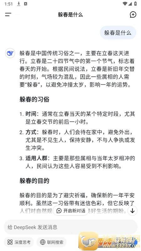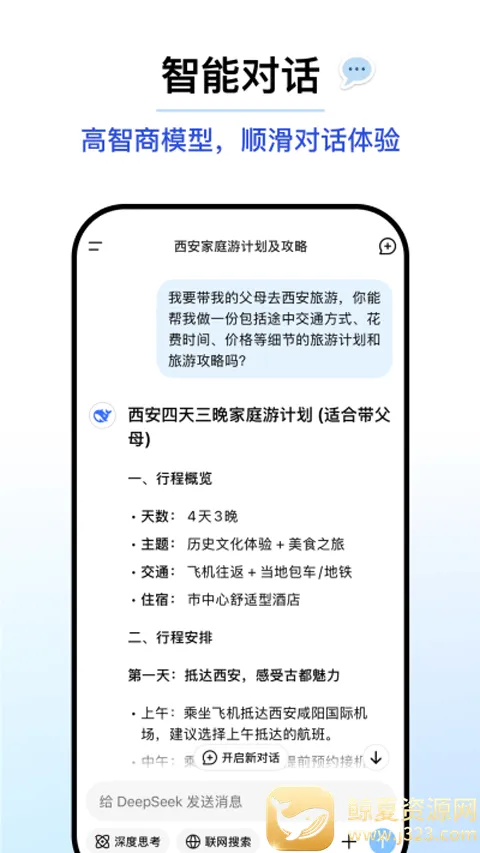 深度求索是一款超棒的AI对话软件。它能帮你快速解决各种问题。不管是日常的小疑问,还是专业领域的难题,只要在应用里提出问题,就能迅速获得详尽答案。使用起来超方便,点击中间输入栏输入问题,发送后稍等片刻就有回应。它能精准理解和生成自然语言,提供语言翻译、文本摘要等多种功能。不仅能回答常识问题,专业领域也不在话下。还能自动生成高质量文案和报告,节省创作时间。支持多种编程语言,帮程序员快速定位并解决问题。对学习者提供详细解题步骤,提升学习效果。给内容创作者助力撰写创意文案,提高工作效率。也为多语言用户提供精准翻译,沟通无障碍。总之,深度求索能全方位满足你的需求,带来极大便利。