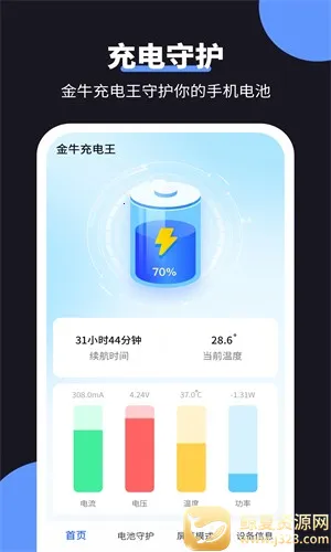 金牛充电王app能显著延长手机电池寿命,提升续航时长,对日常使用助力极大。它可保护充电中的手机电池,设备状况与手机信息清晰呈现。充电进度实时掌握,还能定期保养电池。能轻松优化手机,过热时会提醒。可查询电池信息,维护电池健康,完成充电任务还能赚取奖励。支持电池管理,实时查看充电及使用情况,安卓机主均可使用,同步检测电池问题,诸多功能满足多样充电需求。