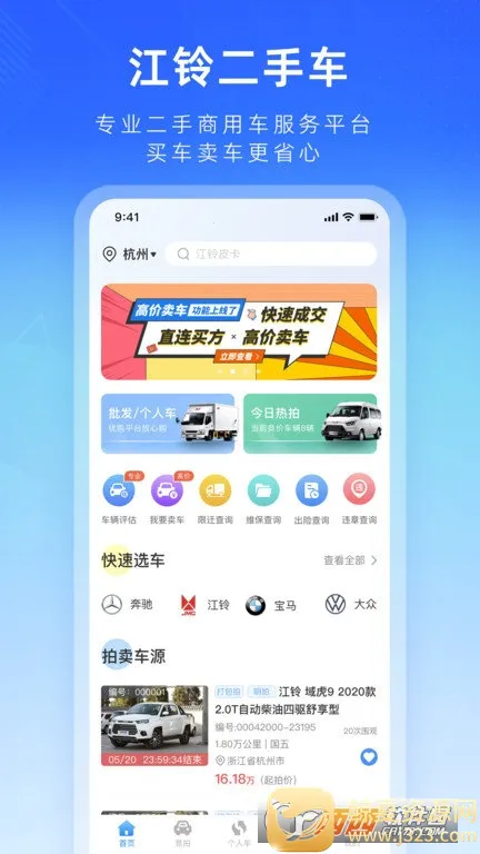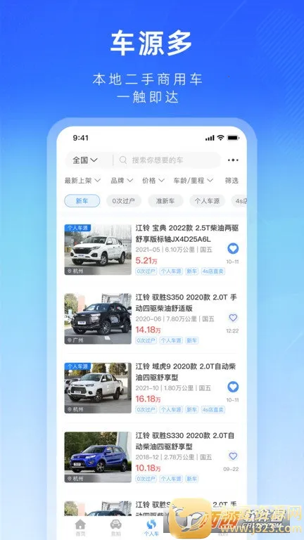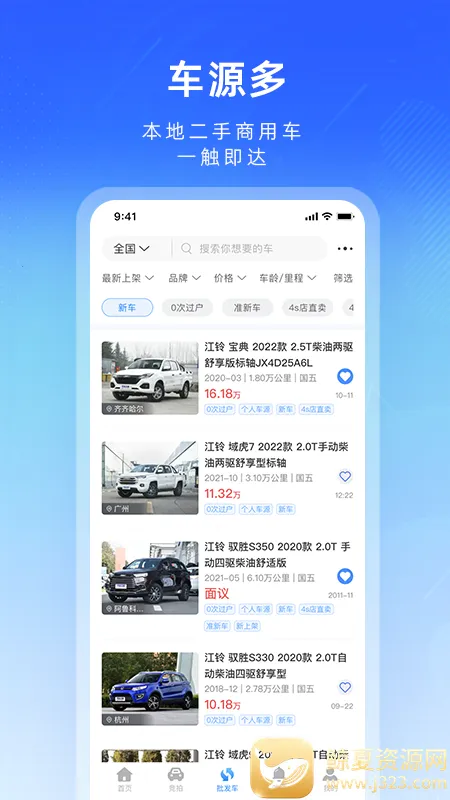 如果你想买二手车,江铃二手车 app 绝对是个不错的选择!它能为咱解决不少购车难题。这里车源超多,涵盖本地及周边二手商用车信息,满足不同人的购车需求。你可以轻松查看车辆详细信息,包括车况、里程数、年限等,还能通过智能推荐快速定位适合自己的车。而且,它有多种竞拍方式,像明拍、暗拍、一口价、超级拍,满足各种需求和喜好。明拍透明公正,暗拍保护隐私,一口价省心,超级拍刺激有趣。购车者能根据市场行情做出明智决策,还能通过充值提现方便地管理资金。另外,平台还有专业客服一对一服务,提供违章信息查询功能。每日更新热拍活动,还有甄选专场车源。总之,江铃二手车 app 让二手车交易变得便捷、透明又有趣,快来下载体验吧!