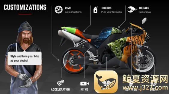 如果你热爱疯狂刺激的摩托车竞速,那这款游戏绝对适合你!它有着高自由度与多样化玩法,多种模式任你选,像竞赛、自由驾驶、警察追击、每日竞赛等。四大主题场景,乡村、沙漠、冬季、城市,还能自由切换白昼、日暮、黑夜,感受不同环境下的驾驶挑战。自定义板块超棒,能调整比赛规则,比如天气、交通密度等。游戏里有14种相机角度,让你体验更逼真。16种不同摩托车,细节超到位,还能改善性能、更改设计。有4个不同团伙头目和数十个关卡,4个控制选项,支持23种语言。还有逃避模式、每日奖励模式、私人模式。玩法简单易上手,触摸屏幕就能控制加速、刹车,倾斜手机就能转弯。大量关卡,独特障碍,丰富地图,众多独特赛车可解锁改装。快来开启你的疯狂摩托车技之旅吧!